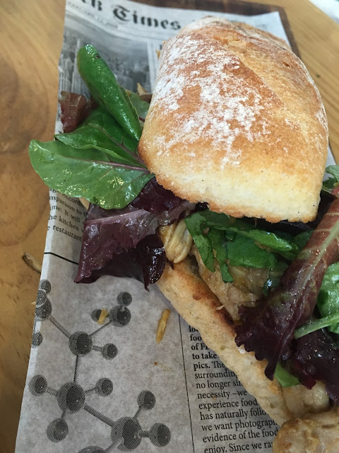 Álvaro se decantó por el entrepan de Almazara & Pollo, un pan de aceite tostado, pollo confitado en especias y ensalada: