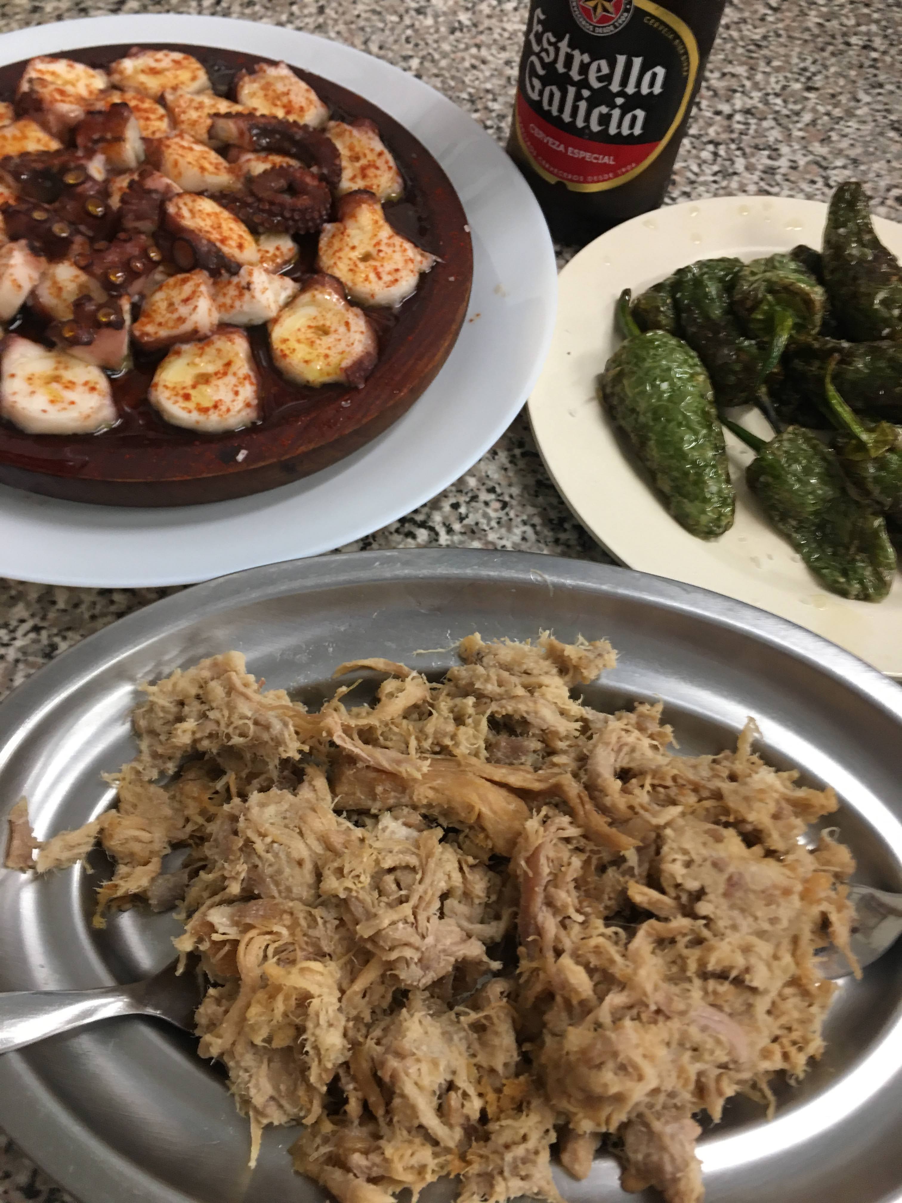 Todo estaba riquísimo. Los pimientos de Padrón fritos y sin ninguno picante. Los chicharrones allí en Galicia es un plato de carne de cerdo deshilachada con sabor potente.
